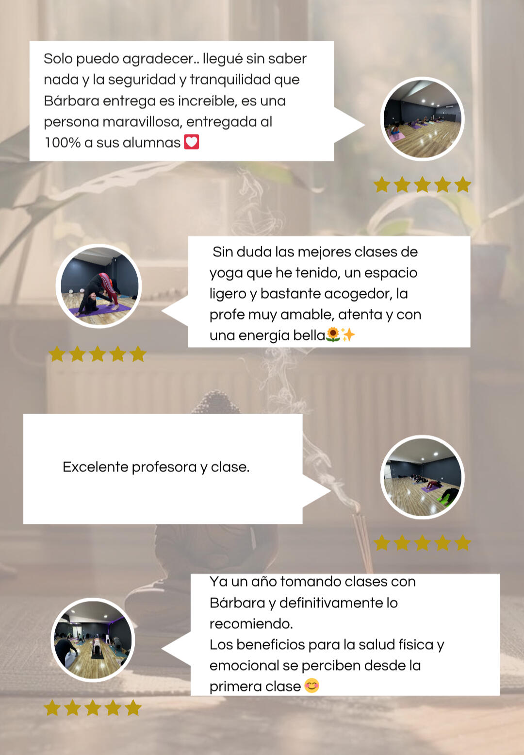 Soy Bárbara Santibañez, fundadora de Barby Mística – Yoga Studio. Profesora de Yoga certificada con más de 500 horas de formación, mi camino ha estado marcado por la búsqueda de una práctica real, espiritual y consciente.Creo en un yoga que no exige, que no disfraza, sino que acompaña. Enseño desde la presencia, con respeto por cada cuerpo y cada proceso. Mi enfoque une la técnica con la escucha interna, el movimiento con la calma, el ejercicio físico con la conexión profunda.Este estudio nace como un espacio íntimo, donde cada práctica es una oportunidad para habitarte con amor, sin exigencias ni apariencias.