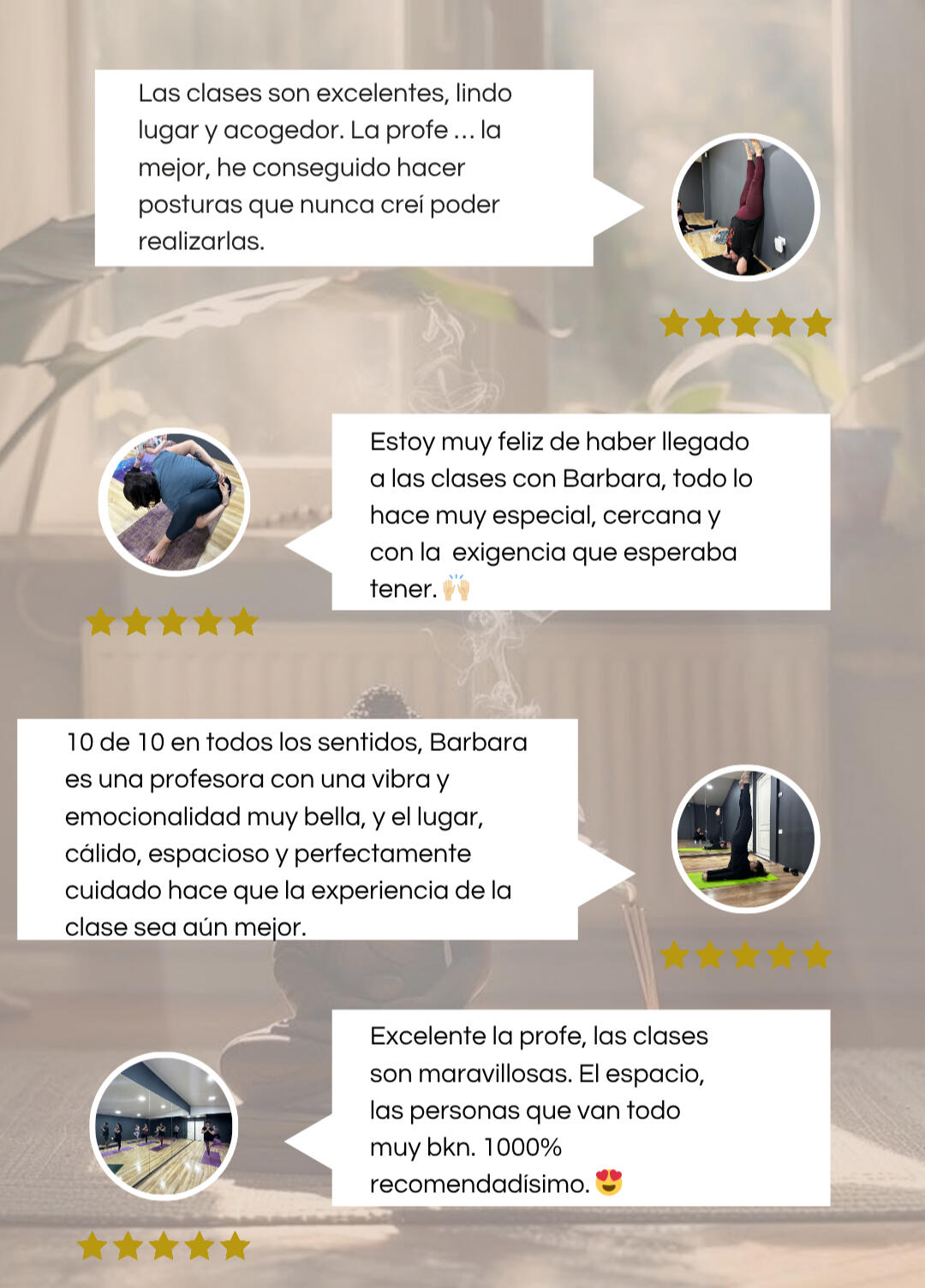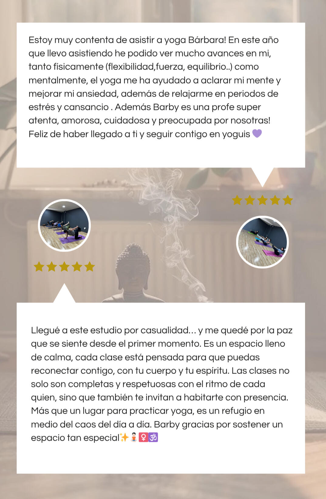 Soy Bárbara Santibañez, fundadora de Barby Mística – Yoga Studio. Profesora de Yoga certificada con más de 500 horas de formación, mi camino ha estado marcado por la búsqueda de una práctica real, espiritual y consciente.Creo en un yoga que no exige, que no disfraza, sino que acompaña. Enseño desde la presencia, con respeto por cada cuerpo y cada proceso. Mi enfoque une la técnica con la escucha interna, el movimiento con la calma, el ejercicio físico con la conexión profunda.Este estudio nace como un espacio íntimo, donde cada práctica es una oportunidad para habitarte con amor, sin exigencias ni apariencias.
